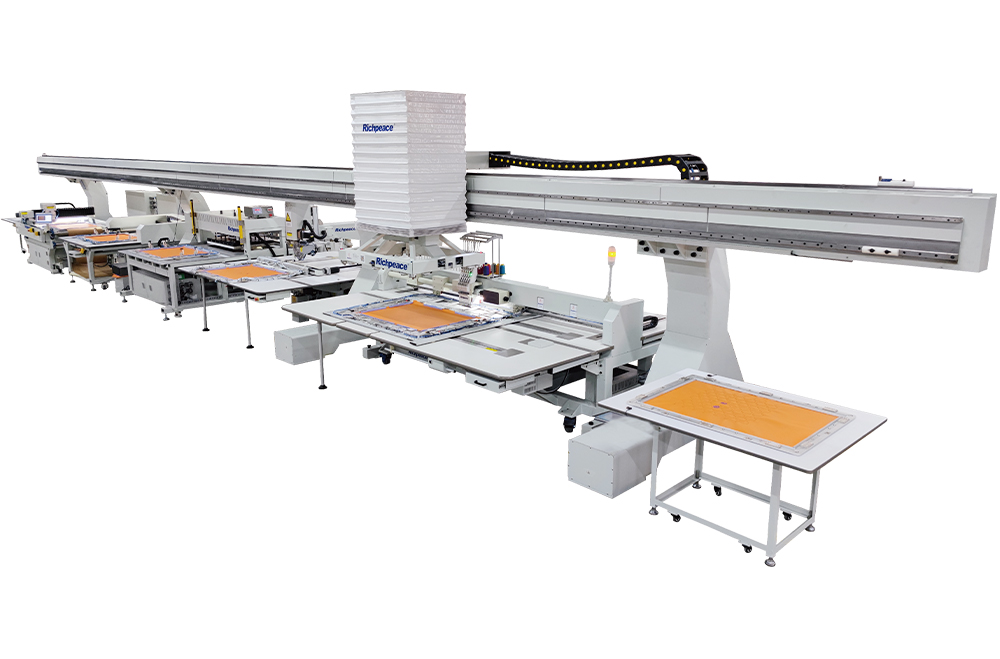 富怡全自動沖、復、縫、繡生產線是一款全新概念的,集皮革沖孔、檢測、復合、縫紉、刺繡五個加工單元為一體的的自動化生產線。通過自動轉序加工方式實現夾料工裝在各加工單元之間的無縫轉序。整線只需一個人工參與輔助,即可輕松實現整線的正常運轉。沖孔工位可實現沖孔速度最高1000孔/分鐘,檢測工位可根據沖孔的花樣進行匹配,單片復合時間10秒即可完成, 縫紉最高速度2500轉/分鐘,刺繡最高速度1200針/分鐘。全線引入富怡物聯網系統,可對產線進行狀態實現實施監控和輔助決策,實現制造物聯化。
