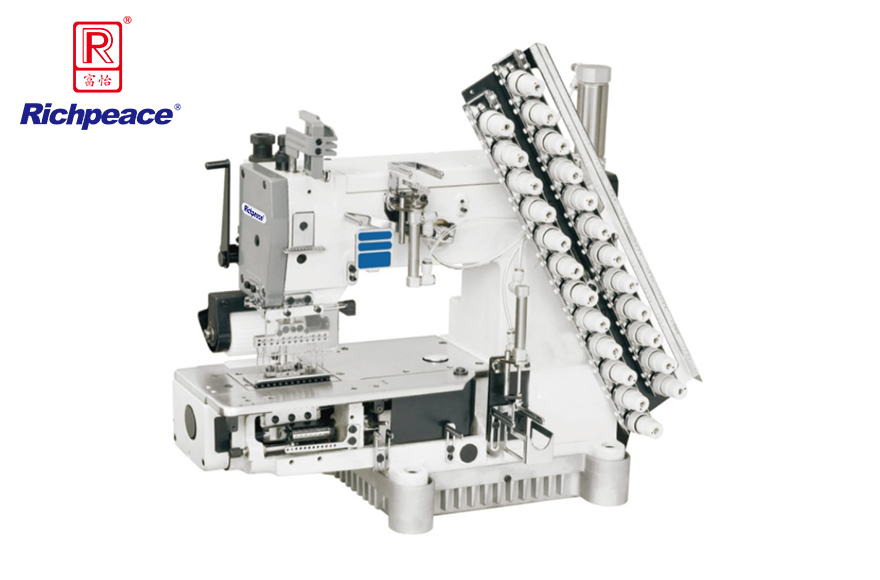 完全自動給油,勾針縱向運動機構,筒型方便圓型衣物之縫紉,此機型可依要求之縫制款式,間隔尺寸做多樣針位變化車縫。適用于高級衣物之裝飾車縫。