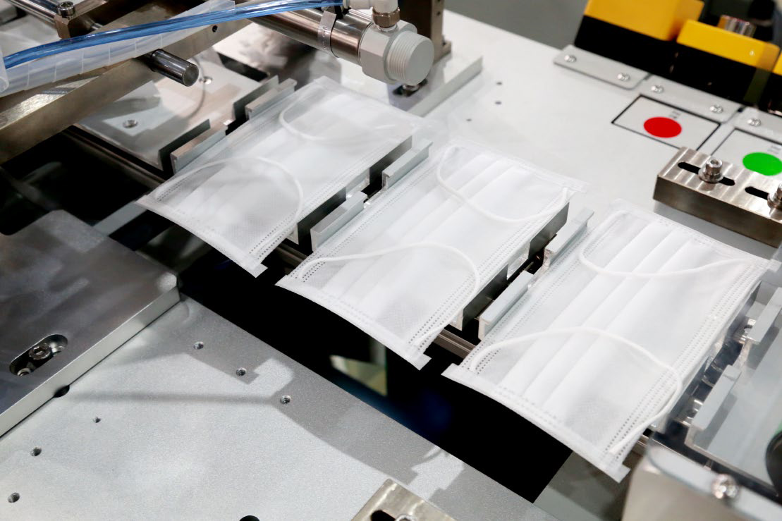 1.面層、濾層(或雙濾層)、底層三卷或四卷面料自動對齊入料,雙邊對稱超聲連續壓邊,經連續滾輪壓邊切斷后,進行耳帶焊接以提高生產 效率,焊完耳帶和包邊切斷后自動計數碼堆。