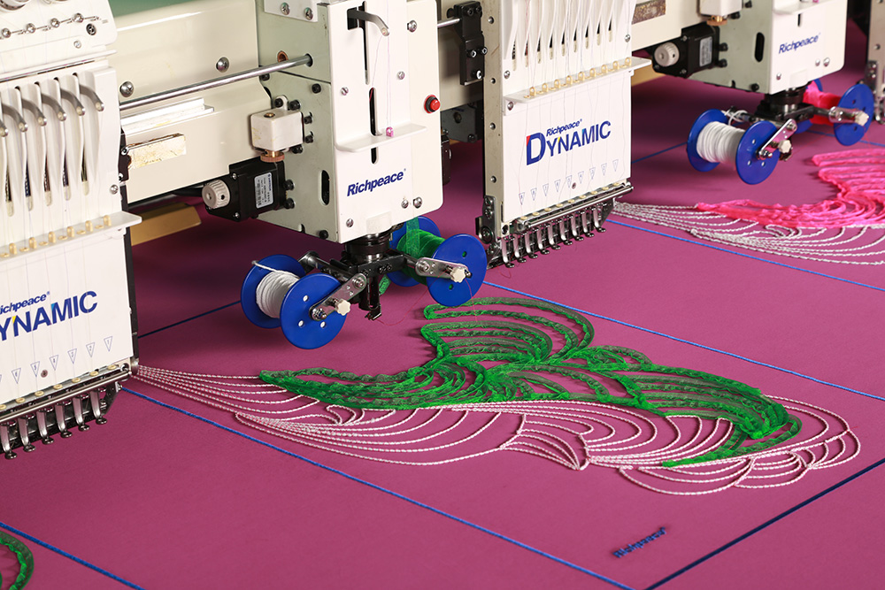 繡作特點:平繡頭有換色剪線功能;毛巾繡具換色剪線功能;轉彎不降速;可單頭自動補 繡;特種頭可以進行毛巾、鏈式、亮片繡等;