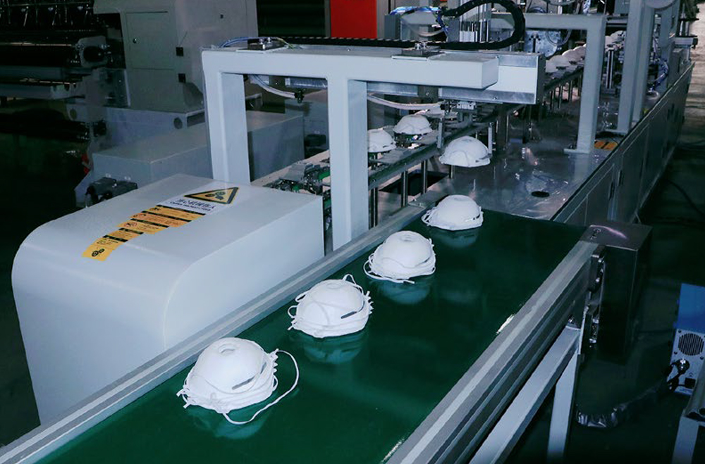 2、富怡全自動罩杯口罩生產線實現了罩杯口罩從卷料到成品的整個流程。該生產線主要由以下工位組成:料架、上杯體成型、杯體成型、轉序、移印、鼻梁條焊接、頭帶焊接、呼吸閥打孔超聲波焊接、口罩拾取。每臺機器根據客戶需求選擇進行設計安裝。