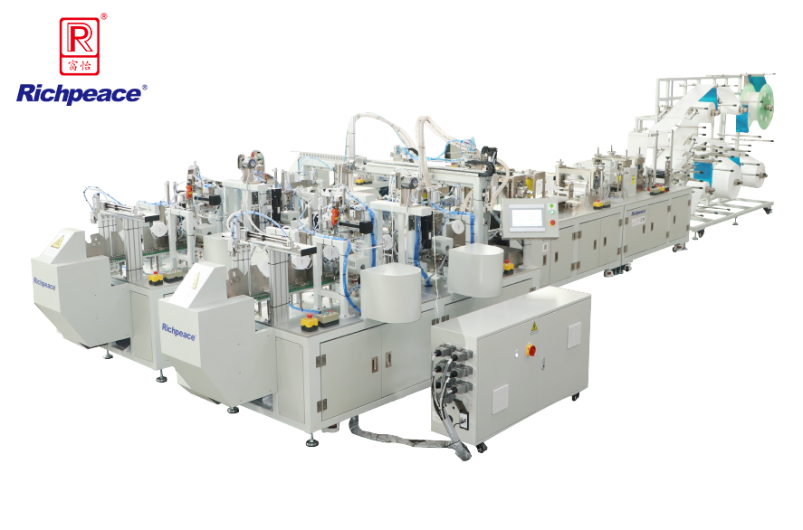 2、分體式設計,面層、濾層、底層3-6卷面料自動對齊入料,自動嵌入鼻梁條,自動噴印LOGO,切割成型,自動抓取口罩片及分流,口罩片傳輸、頭帶焊接、口罩成品出料全自動化控制。